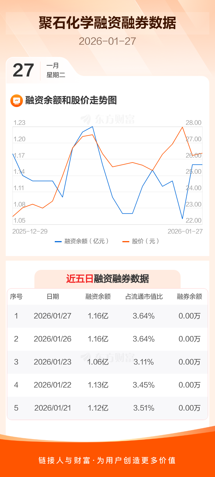 交易所最新数据显示,聚石化学于2026年1月27日获融资买入406.77万元,融资偿还357.10万元,当日融资净买入49.67万元。目前,该股融资余额1.16亿,占流通市值比例为3.64%。