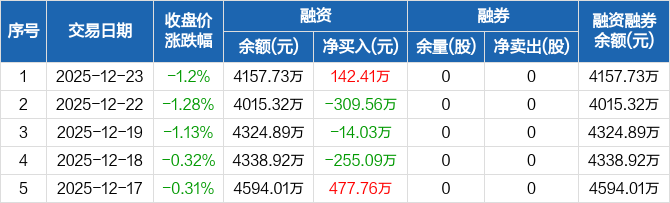 金迪克:融资净买入142.41万元,融资余额4157.73万元(12-23)