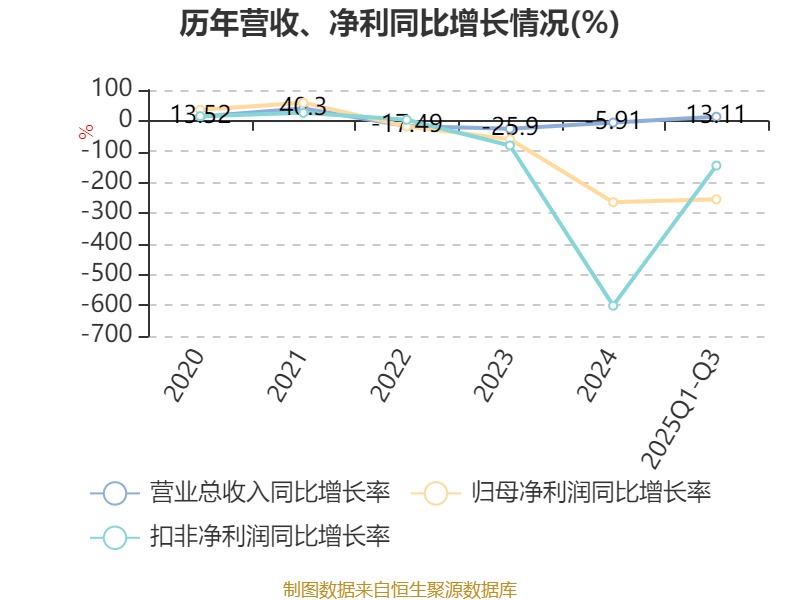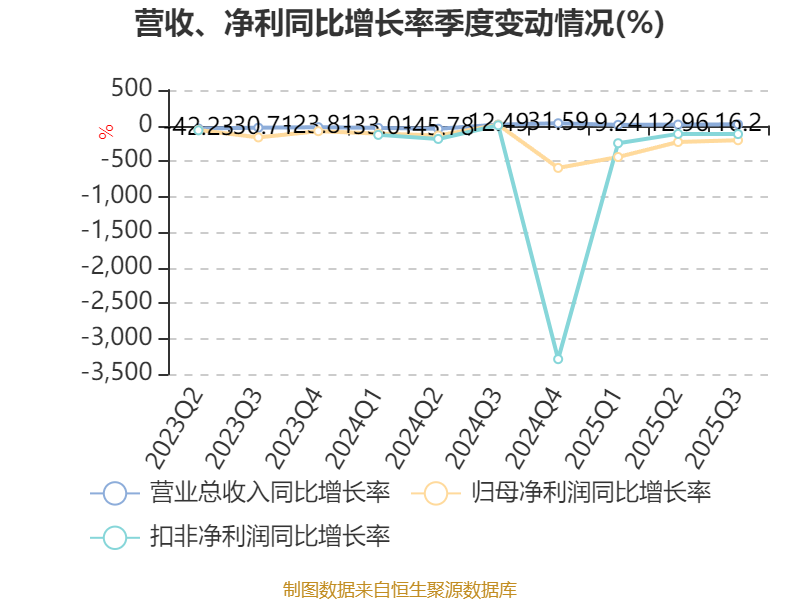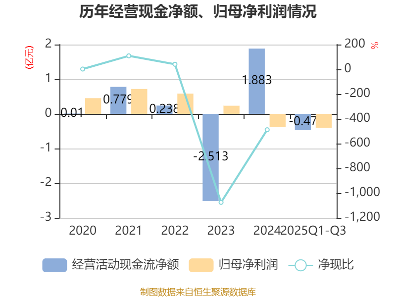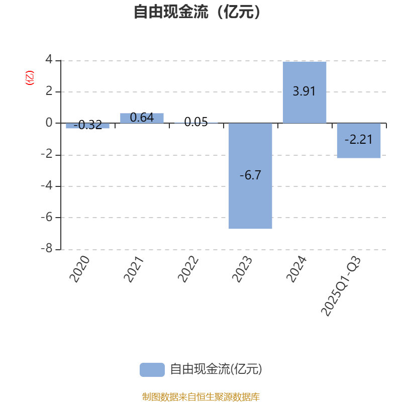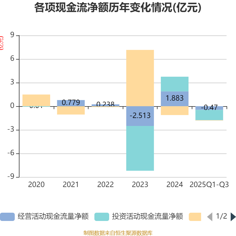 2025年前三季度,公司经营活动现金流净额为-4703.68万元,同比减少2.1亿元;筹资活动现金流净额-468.1万元,同比增加9583.04万元;投资活动现金流净额-1.31亿元,上年同期为-6696.53万元。