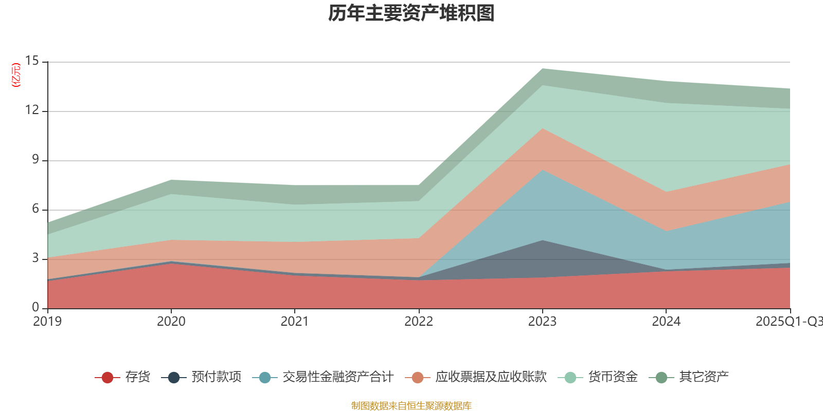 资产重大变化方面,截至2025年三季度末,公司货币资金较上年末减少37.31%,占公司总资产比重下降13.77个百分点;交易性金融资产合计较上年末增加58.91%,占公司总资产比重上升10.9个百分点;存货较上年末增加9.76%,占公司总资产比重上升2.19个百分点;预付款项较上年末增加185.13%,占公司总资产比重上升1.41个百分点。