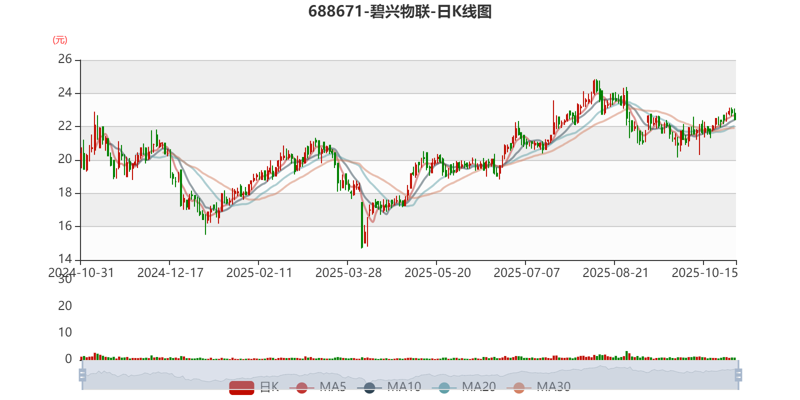 中证智能财讯碧兴物联(688671)10月31日披露2025年第三季度报告。前三季度公司实现营业总收入1.85亿元,同比增长13.11%;归母净利润亏损4031.59万元,上年同期亏损1134.79万元;扣非净利润亏损4848.39万元,上年同期亏损1972.19万元;经营活动产生的现金流量净额为-4703.68万元,上年同期为1.63亿元;报告期内,碧兴物联基本每股收益为-0.51元,加权平均净资产收益率为-3.73%。