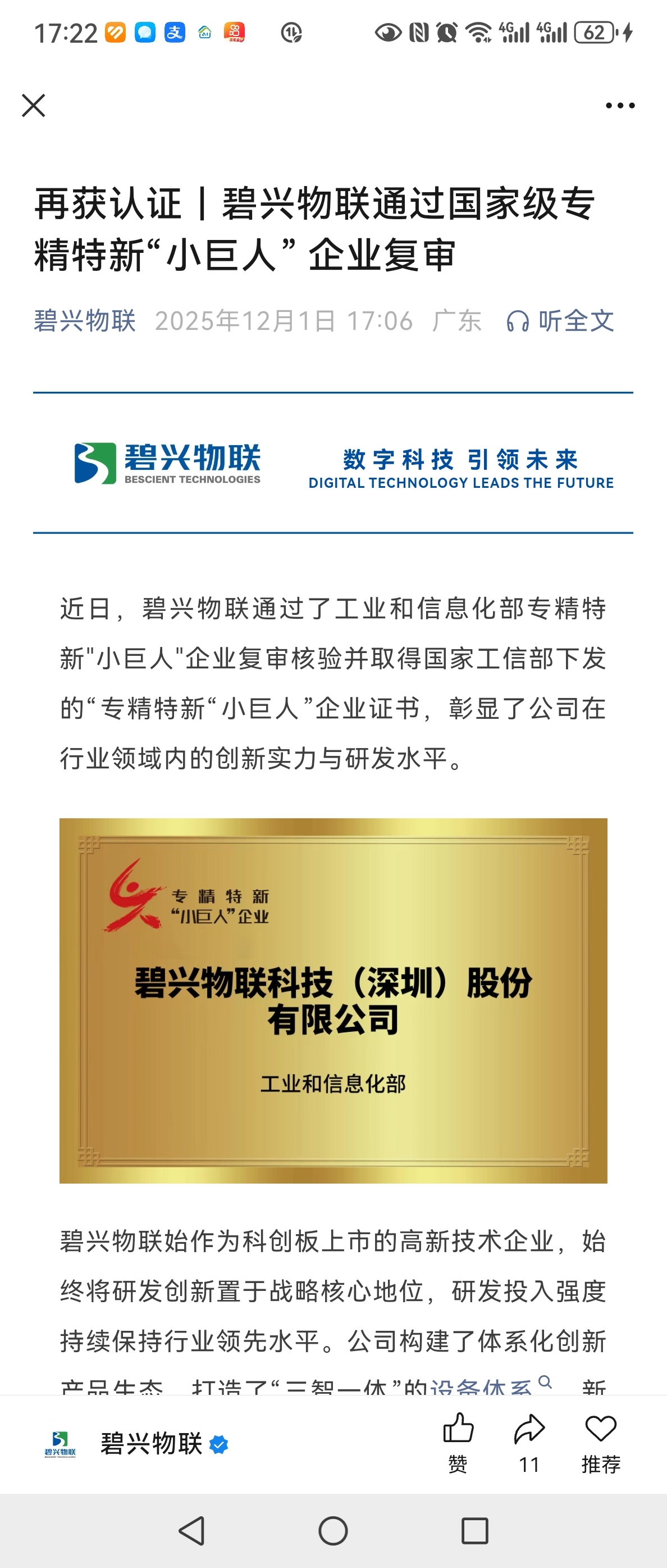 $碧兴物联(SH688671)$ 碧兴物联通过了工业和信息化部专精特新"小巨人"企业复审核验并取得国家工信部下发的“专精特新“小巨人”企业证书