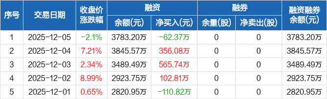 碧兴物联:融资净偿还62.37万元,融资余额3783.2万元(12-05)
