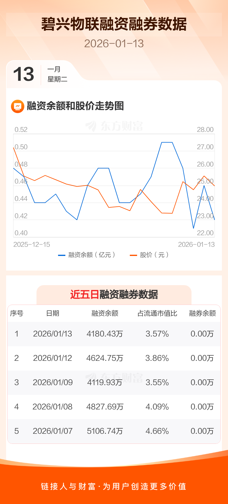 交易所最新数据显示,碧兴物联于2026年1月13日获融资买入449.94万元,融资偿还894.27万元,当日融资净偿还444.32万元。目前,该股融资余额4180.43万,占流通市值比例为3.57%。