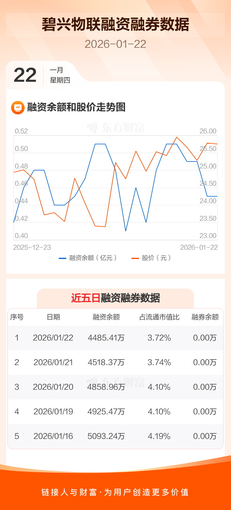 交易所最新数据显示,碧兴物联于2026年1月22日获融资买入240.74万元,融资偿还269.06万元,当日融资净偿还28.32万元。目前,该股融资余额4485.41万,占流通市值比例为3.72%。