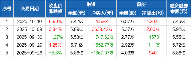 融资方面,当日融资买入3.01亿元,融资偿还1.48亿元,融资净买入1.53亿元,净买入额创历史新高。融券方面,融券卖出1.29万股,融券偿还900股,融券余量6.57万股,融券余额385.88万元。融资融券余额合计7.46亿元。