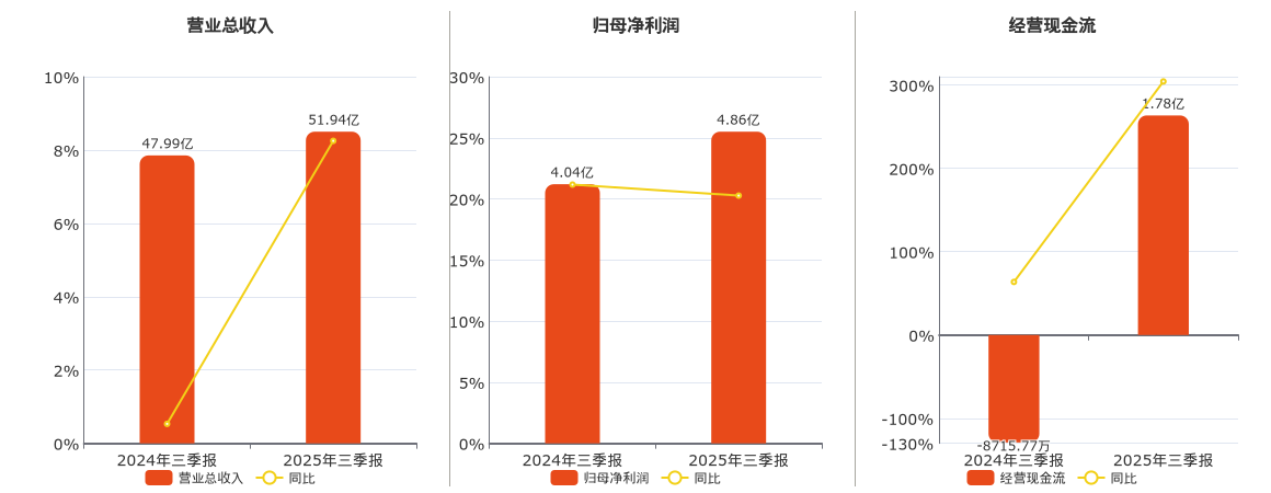 公司营业总收入为51.94亿元。归母净利润为4.86亿元。经营活动现金净流入为1.78亿元。