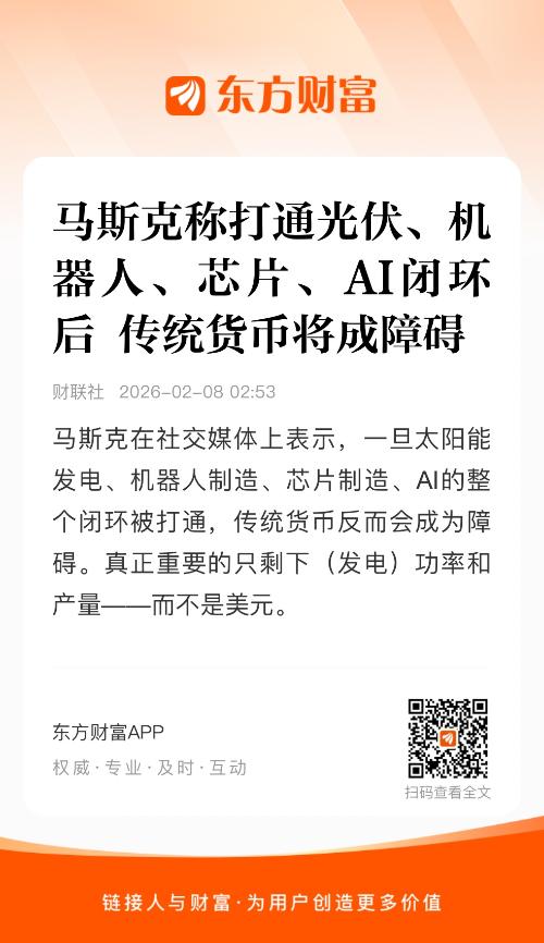 马斯克在社交媒体上表示,一旦太阳能发电、机器人制造、芯片制造、AI的整个闭环被打通,传统货币反而会成为障碍。真正重要的只剩下(发电)功率和产量——而不是美元。