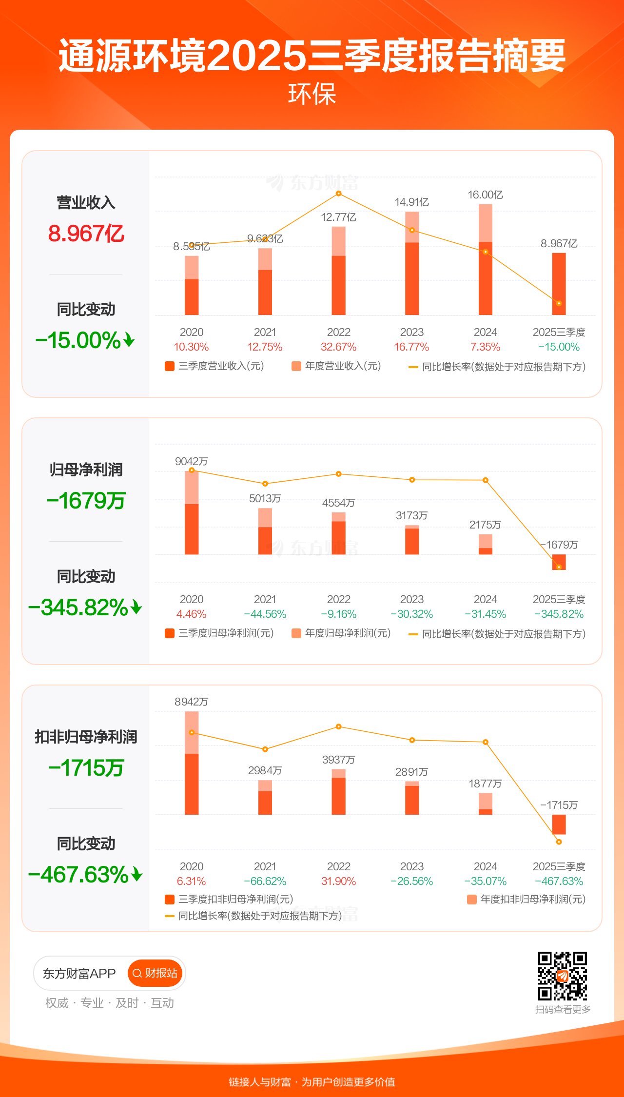 通源环境10月31日发布2025年三季报显示,公司前三季实现营业收入8.97亿元,同比下滑15.00%;归母净利润-1679.41万元;扣非归母净利润-1714.58万元。