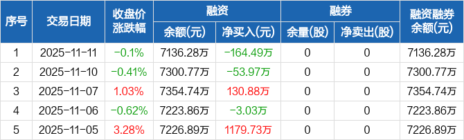 科汇股份:融资净偿还164.49万元,融资余额7136.28万元(11-11)