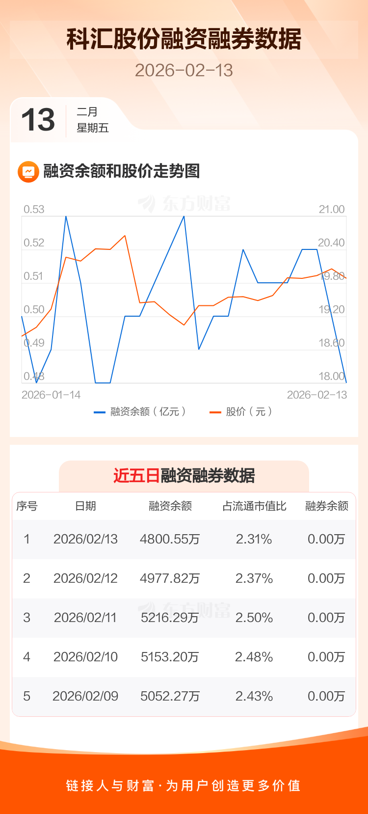 交易所最新数据显示,科汇股份于2026年2月13日获融资买入175.17万元,融资偿还352.45万元,当日融资净偿还177.28万元。目前,该股融资余额4800.55万,占流通市值比例为2.31%。