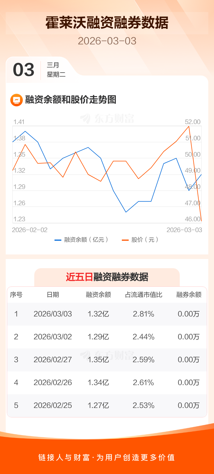 交易所最新数据显示,霍莱沃于2026年3月3日获融资买入1822.03万元,融资偿还1523.32万元,当日融资净买入298.71万元。目前,该股融资余额1.32亿,占流通市值比例为2.81%。