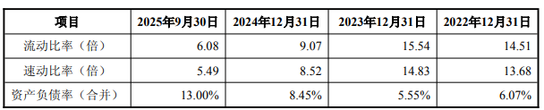 截至2025年三季度末,公司货币资金为2.34亿元,资产总计35.41亿元,资产负债率仅13%。但其偿债能力指标的流动比率和速动比率呈下滑趋势,主要系报告期内公司短期借款、应付账款、其他应付款等项目的规模增长超过流动资产增长速度。