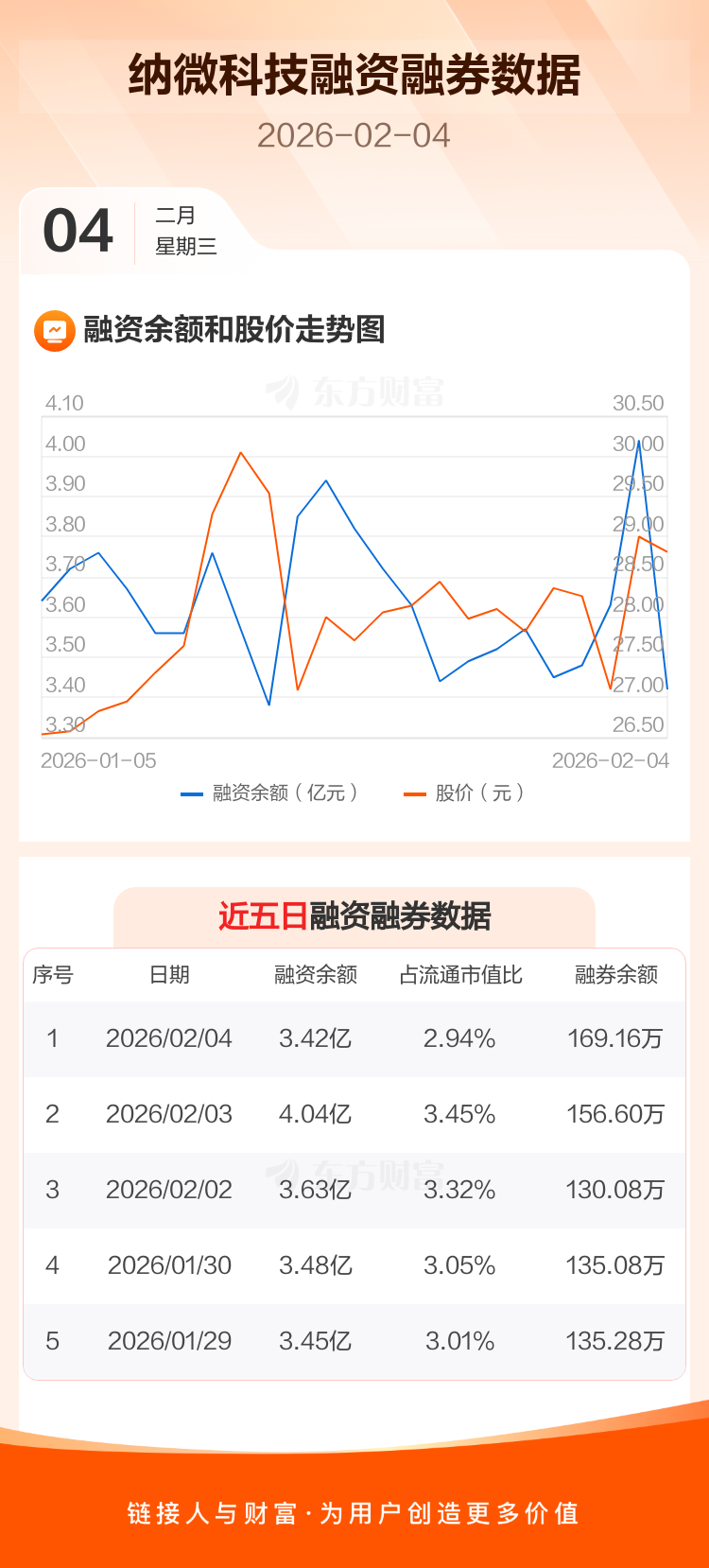 交易所最新数据显示,纳微科技于2026年2月4日获融资买入1949.28万元,融资偿还8173.67万元,当日融资净偿还6224.39万元。目前,该股融资余额3.42亿,占流通市值比例为2.94%。
