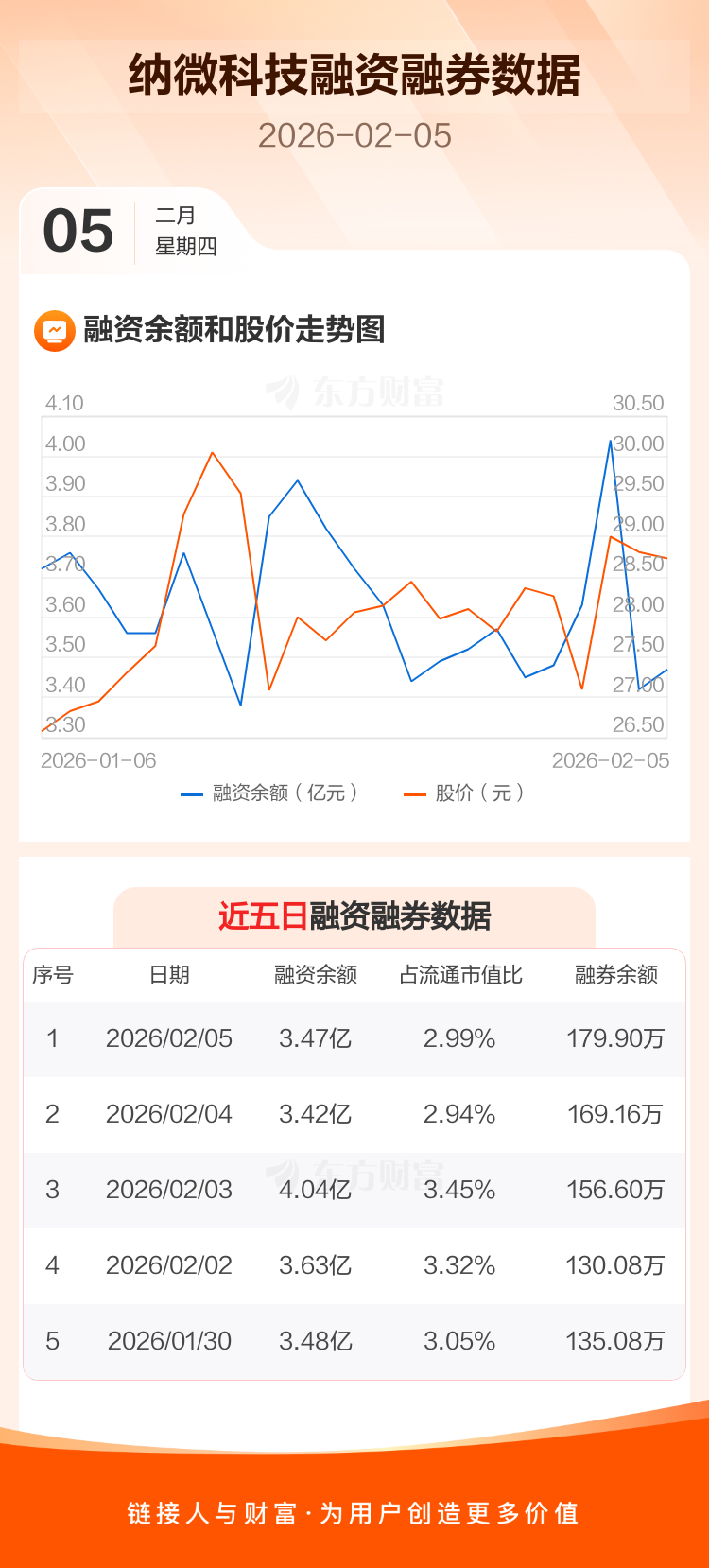 交易所最新数据显示,纳微科技于2026年2月5日获融资买入2218.09万元,融资偿还1655.85万元,当日融资净买入562.24万元。目前,该股融资余额3.47亿,占流通市值比例为2.99%。