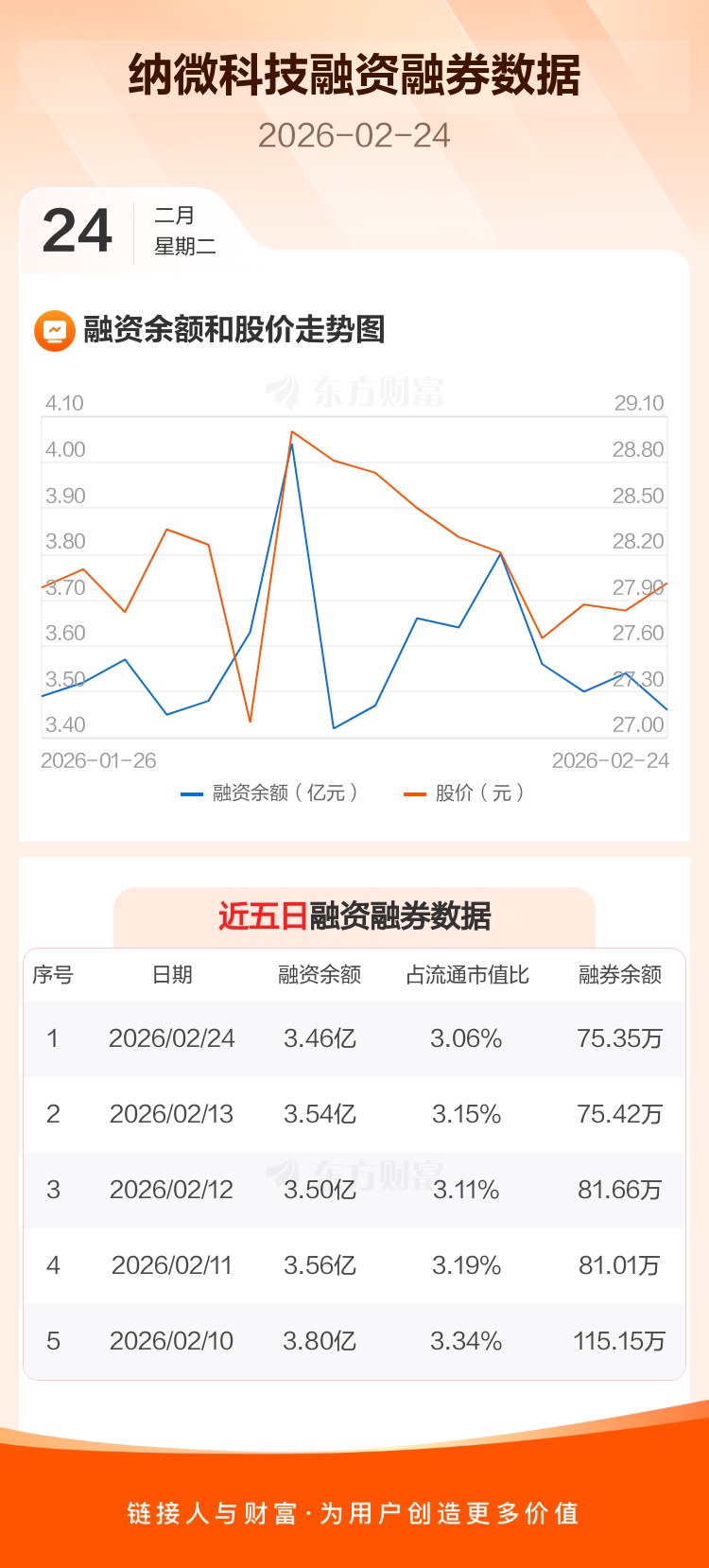 交易所最新数据显示,纳微科技于2026年2月24日获融资买入1975.49万元,融资偿还2737.35万元,当日融资净偿还761.86万元。目前,该股融资余额3.46亿,占流通市值比例为3.06%。