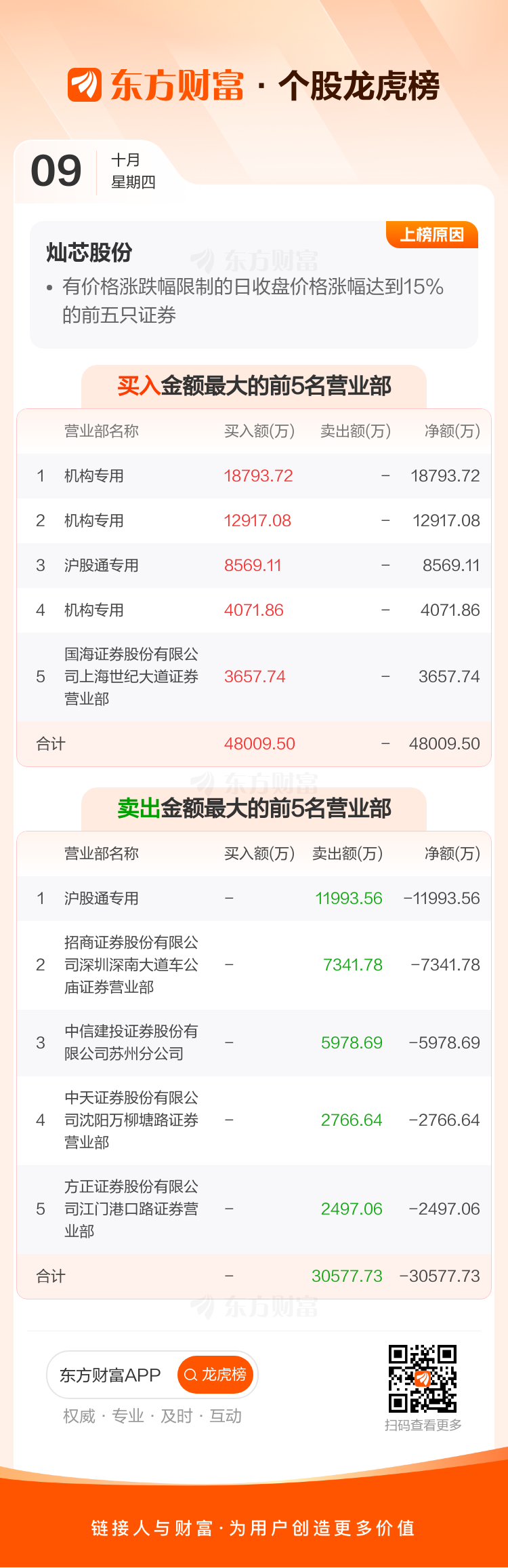 交易所2025年10月9日公布的交易公开信息显示,灿芯股份因成为有价格涨跌幅限制的日收盘价格涨幅达到15%的前五只证券、有价格涨跌幅限制的连续3个交易日内收盘价格涨幅偏离值累计达到30%的证券上榜。灿芯股份当日收报122.26元,涨跌幅20.00%,偏离值20.00%,换手率23.69%,成交额20.31亿。异常期间9月30日至10月9日,期间涨幅38.49%,累计偏离值33.82%,区间成交额33.44亿。