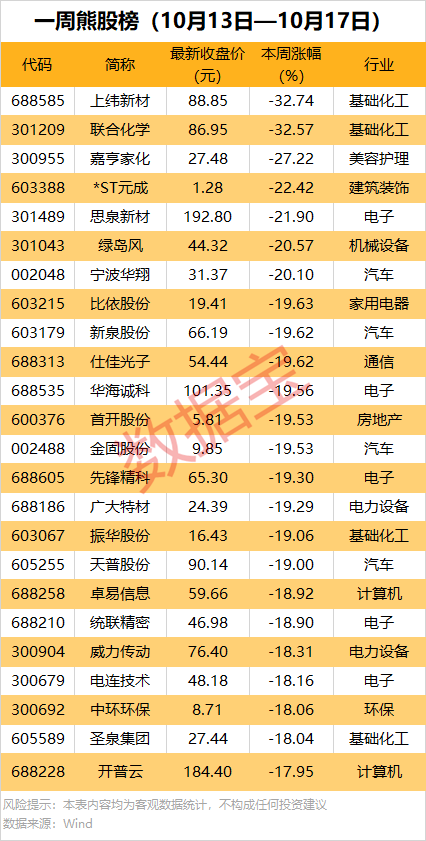 下跌个股中,超480股本周累计跌幅在10%以上,上纬新材和联合化学累计跌幅均超32%。