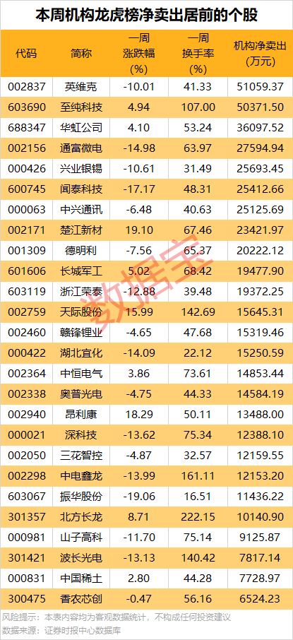 一周机构累计净卖出的个股中,22股金额均超1亿元,其中净卖出金额最多的是英维克,达5.11亿元。该股本周累计下跌10.01%,周换手率为41.33%,因日跌幅偏离值达-7.28%等1次上榜龙虎榜,买卖居前营业部中机构合计净卖出5.11亿元,同时上榜的还有深股通专用席位,净卖出2.75亿元,营业部席位一周合计净卖出5769.22万元。
