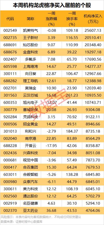龙虎榜数据显示,本周机构专用席位共现身123股龙虎榜,净买入62股,净卖出61股。其中,47股获机构净买入均超千万元,凯美特气、王子新材等11股机构净买入金额均超1亿元。