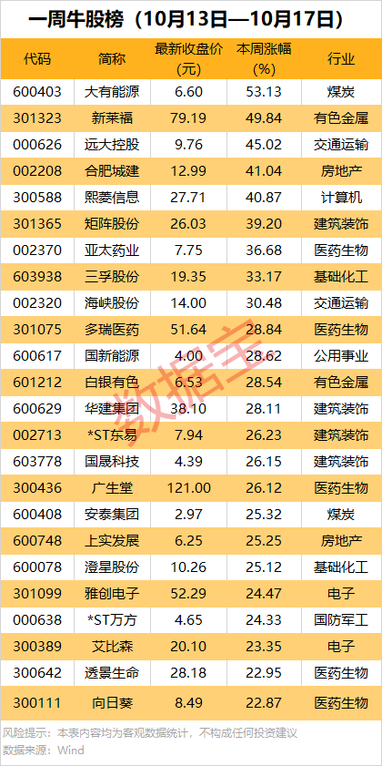 一周牛熊股出炉:大有能源累计涨幅超53%
