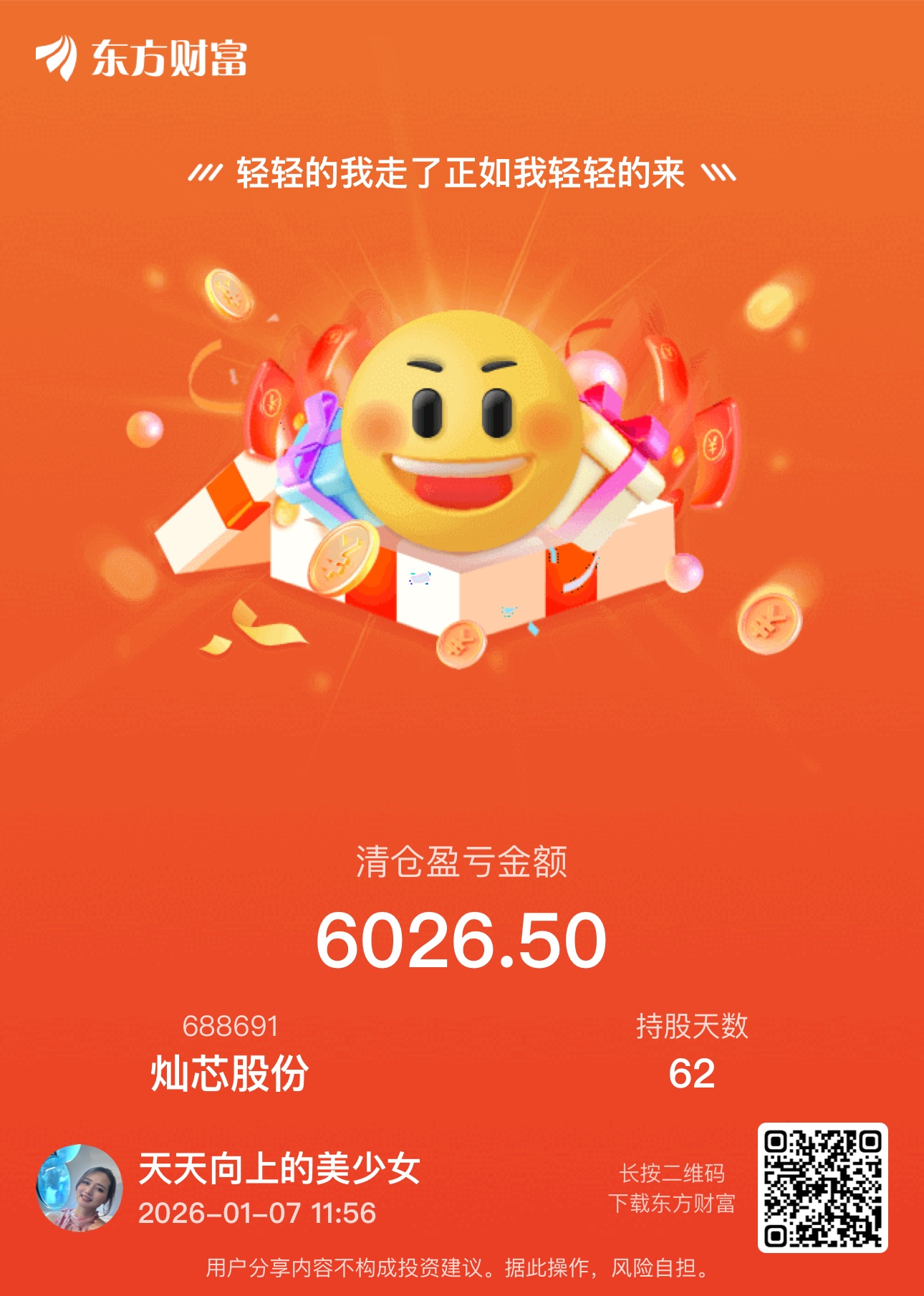 $灿芯股份(SH688691)$ 轻轻的我走了,正如我轻轻的来。回看当初121进场一路跌跌撞撞到今天,谢谢灿芯的小红包,未来还是看好。灿芯再会。#炒股日记# #实盘记录#