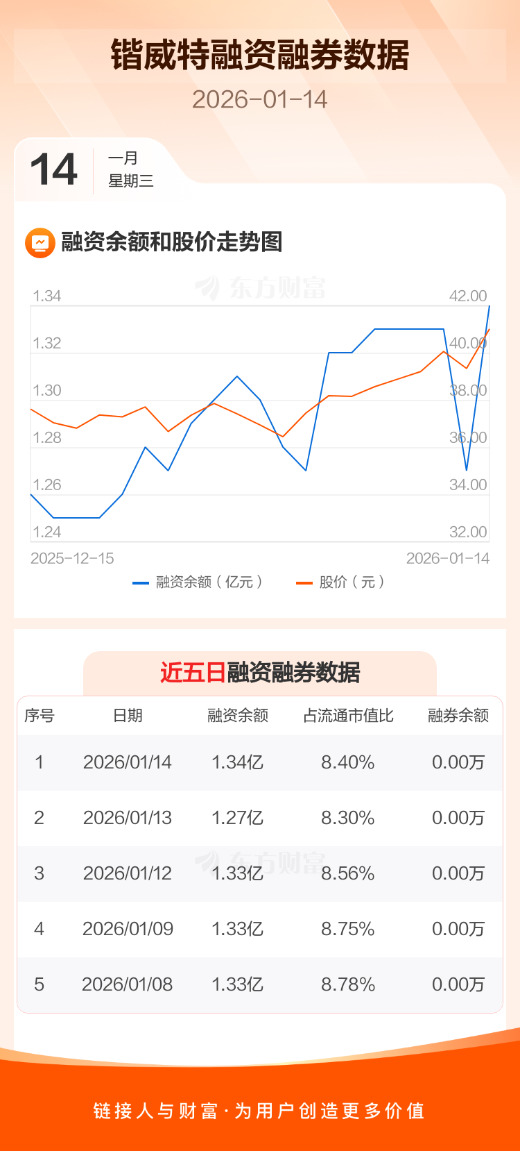 交易所最新数据显示,锴威特于2026年1月14日获融资买入1692.72万元,融资偿还980.48万元,当日融资净买入712.25万元。目前,该股融资余额1.34亿,占流通市值比例为8.40%。