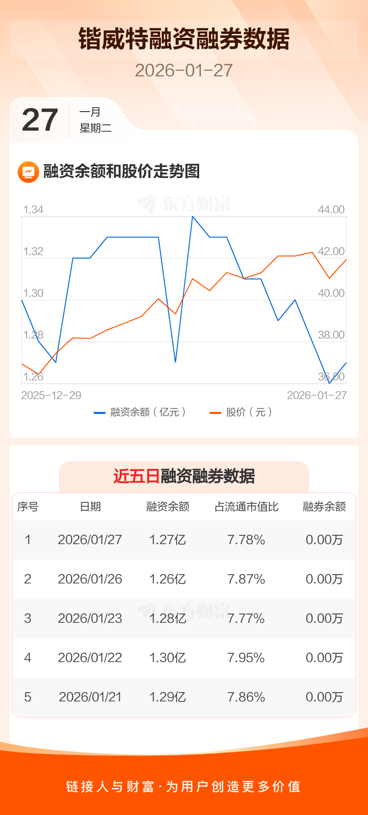 交易所最新数据显示,锴威特于2026年1月27日获融资买入1101.70万元,融资偿还961.22万元,当日融资净买入140.48万元。目前,该股融资余额1.27亿,占流通市值比例为7.78%。