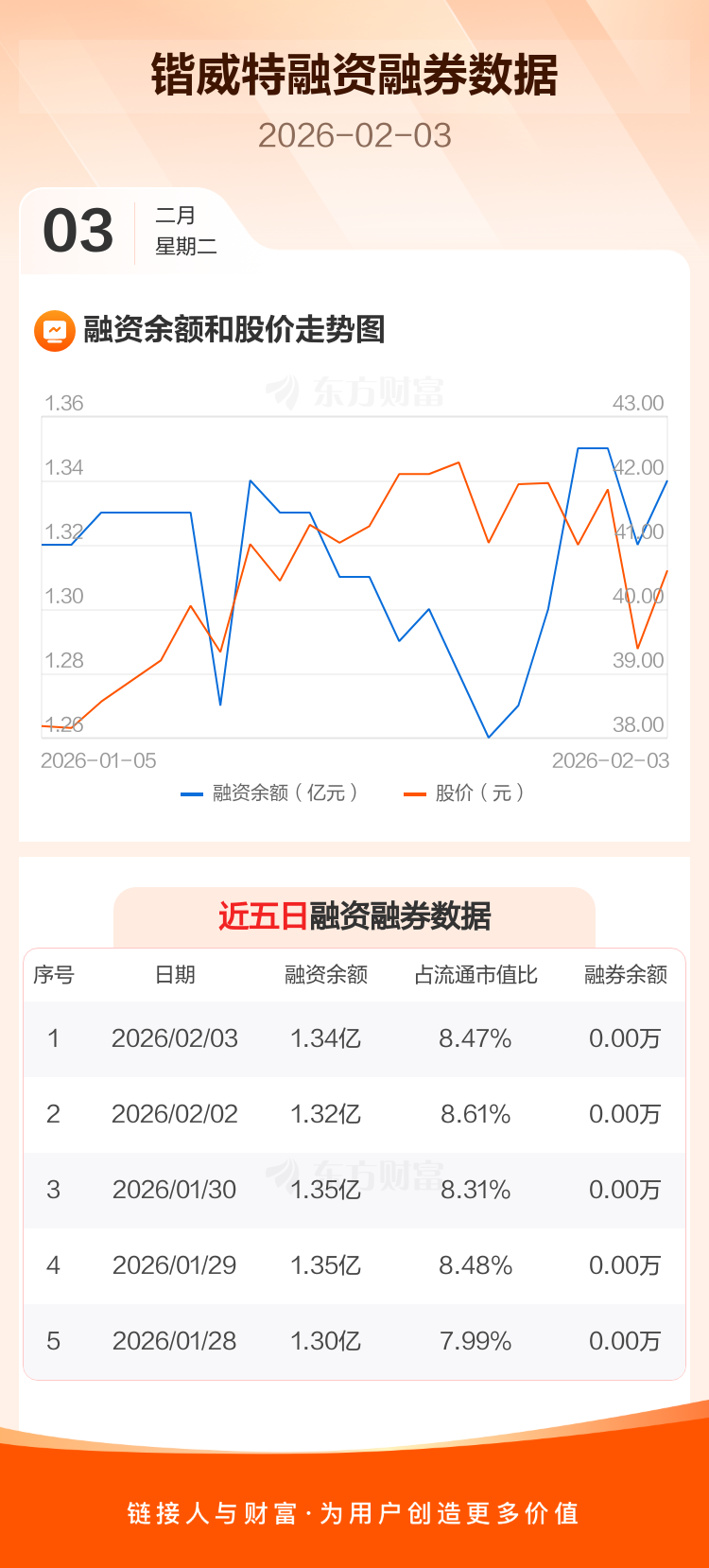 交易所最新数据显示,锴威特于2026年2月3日获融资买入803.52万元,融资偿还629.37万元,当日融资净买入174.15万元。目前,该股融资余额1.34亿,占流通市值比例为8.47%。