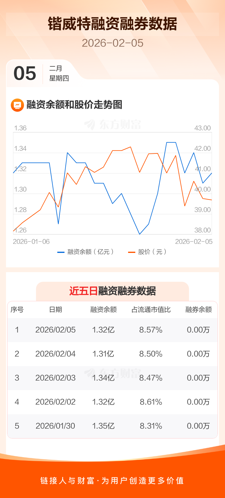 交易所最新数据显示,锴威特于2026年2月5日获融资买入438.20万元,融资偿还351.82万元,当日融资净买入86.38万元。目前,该股融资余额1.32亿,占流通市值比例为8.57%。