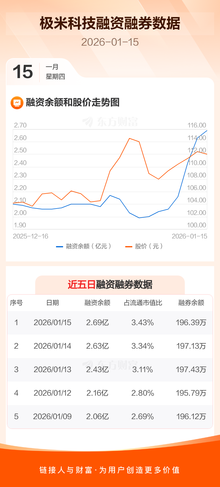 交易所最新数据显示,极米科技于2026年1月15日获融资买入1284.71万元,融资偿还692.74万元,当日融资净买入591.98万元。目前,该股融资余额2.69亿,占流通市值比例为3.43%。