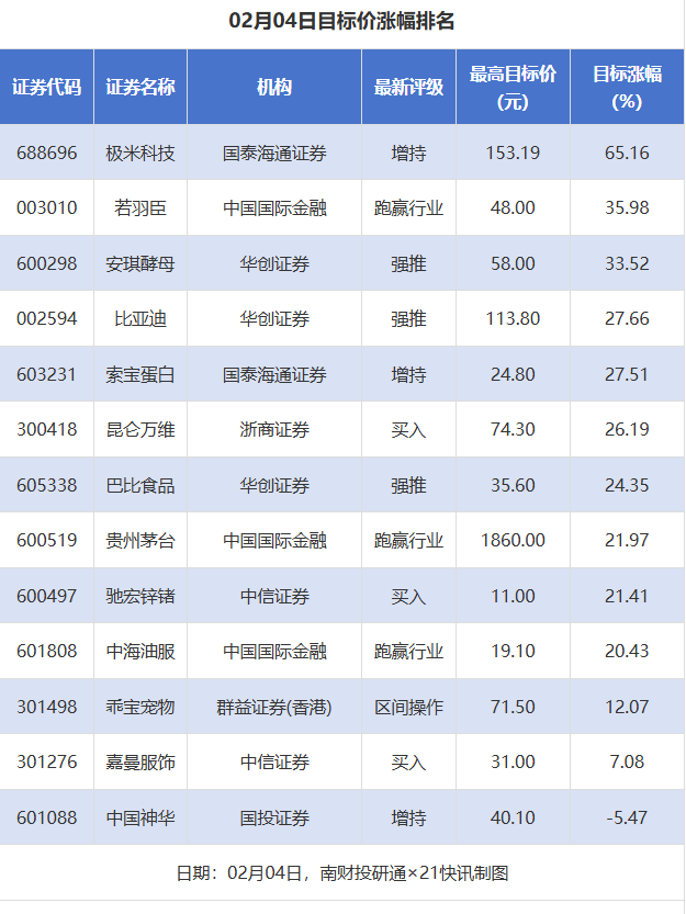 南财投研通数据显示,2月4日,券商给予上市公司目标价共13次,按最新收盘价计算,目标价涨幅排名居前的公司有极米科技、若羽臣、安琪酵母,目标价涨幅分别为65.16%、35.98%、33.52%,分别属于黑色家电、互联网电商、调味发酵品行业。