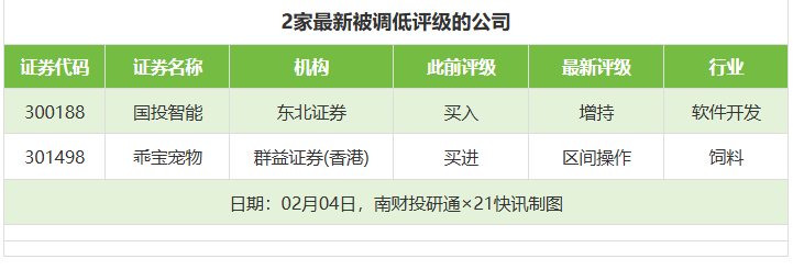 评级调低方面,2月4日,券商调低上市公司评级达到2家次,最新数据包括了东北证券对国投智能的评级从“买入”调低至“增持”,群益证券(香港)对乖宝宠物的评级从“买进”调低至“区间操作”。