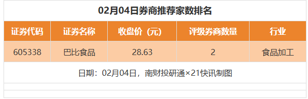 从券商推荐家数来看,2月4日有34家上市公司得到券商推荐,其中巴比食品获得2家推荐,青岛银行、皖能电力均获得1家推荐。