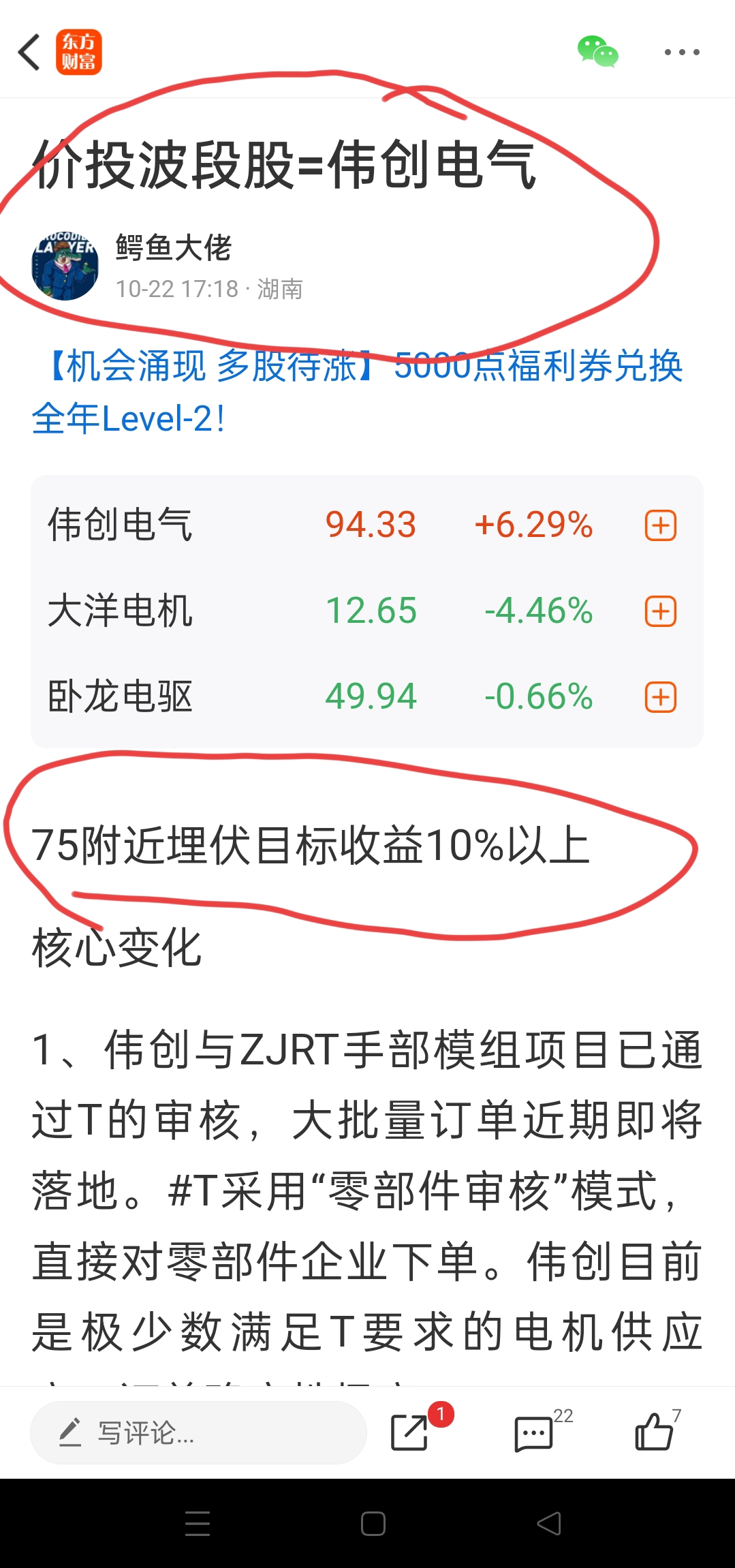 10月22号预报75附近埋伏的伟创电气目前已经完成25%收益,朝着100挺进