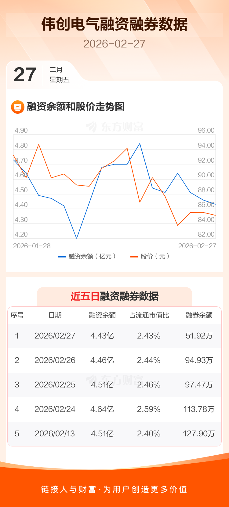 交易所最新数据显示,伟创电气于2026年2月27日获融资买入2829.87万元,融资偿还3190.00万元,当日融资净偿还360.12万元。目前,该股融资余额4.43亿,占流通市值比例为2.43%。