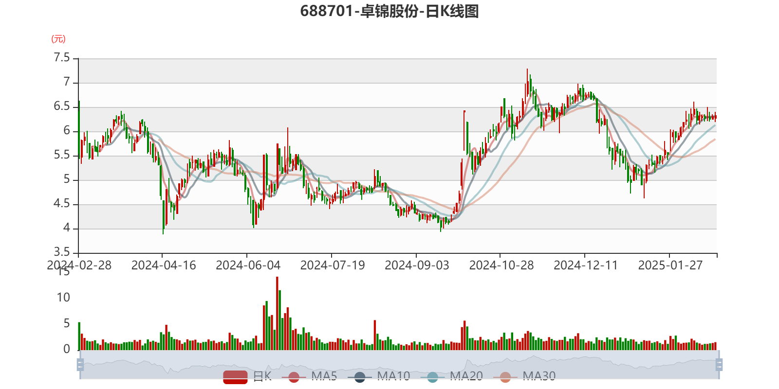 中证智能财讯卓锦股份(688701)2月27日晚间披露2024年业绩快报,公司实现营业收入2.41亿元,同比下降30.63%;归母净利润亏损8309.38万元,上年同期亏损1.21亿元;扣非净利润亏损8373.05万元,上年同期亏损1.2亿元;基本每股收益-0.62元,加权平均净资产收益率为-34.69%。以最新收盘价计算,市净率(LF)约3.56倍,市销率(TTM)约3.26倍。