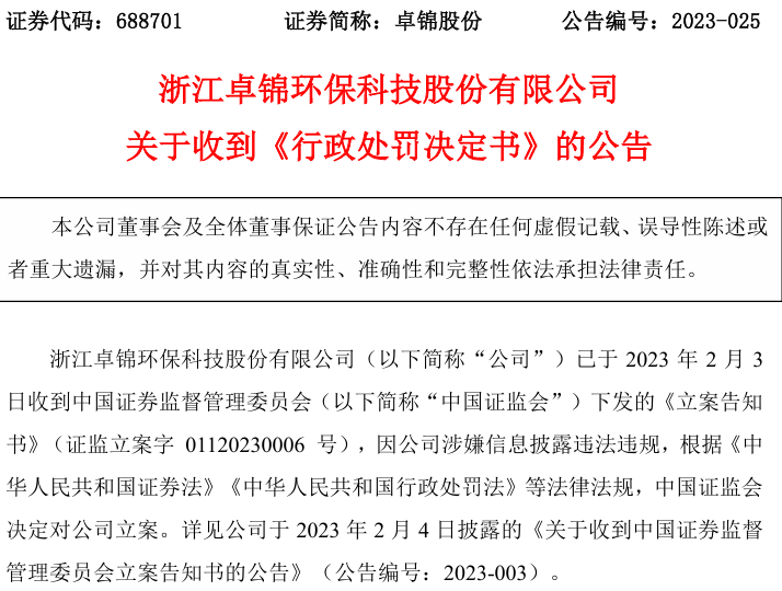 卓锦股份(688701)已被证监会处罚,股民可索赔