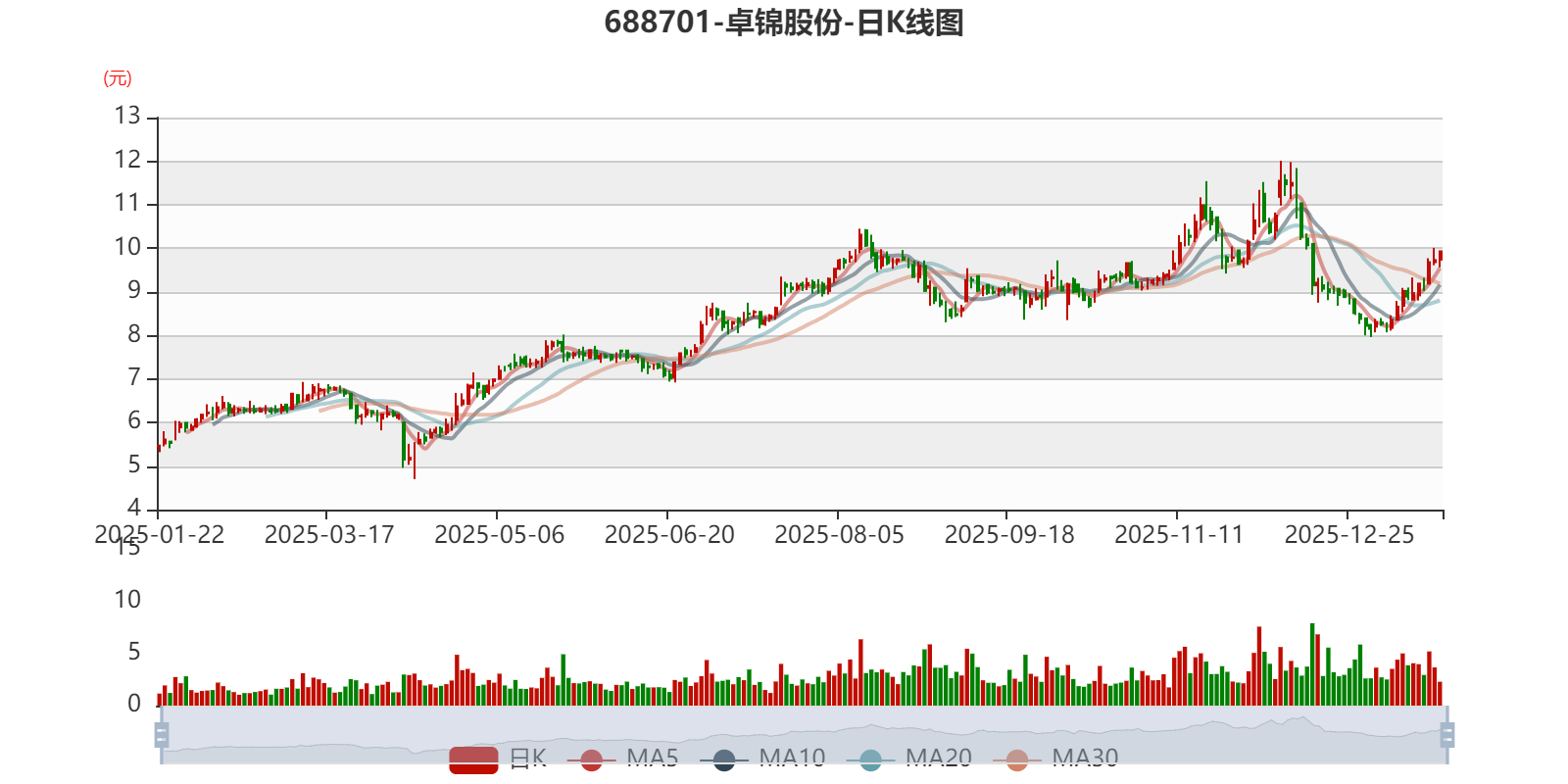 中证智能财讯卓锦股份(688701)1月21日晚间披露2025年度业绩预告,预计2025年实现营业收入1.3亿元,同比下降46.39%;归母净利润亏损5500万元,上年同期亏损8220.22万元;扣非净利润亏损6400万元,上年同期亏损8253.06万元。以1月21日收盘价计算,卓锦股份目前市盈率(TTM)约为-24.24倍,市净率(LF)约9.09倍,市销率(TTM)约10.26倍。