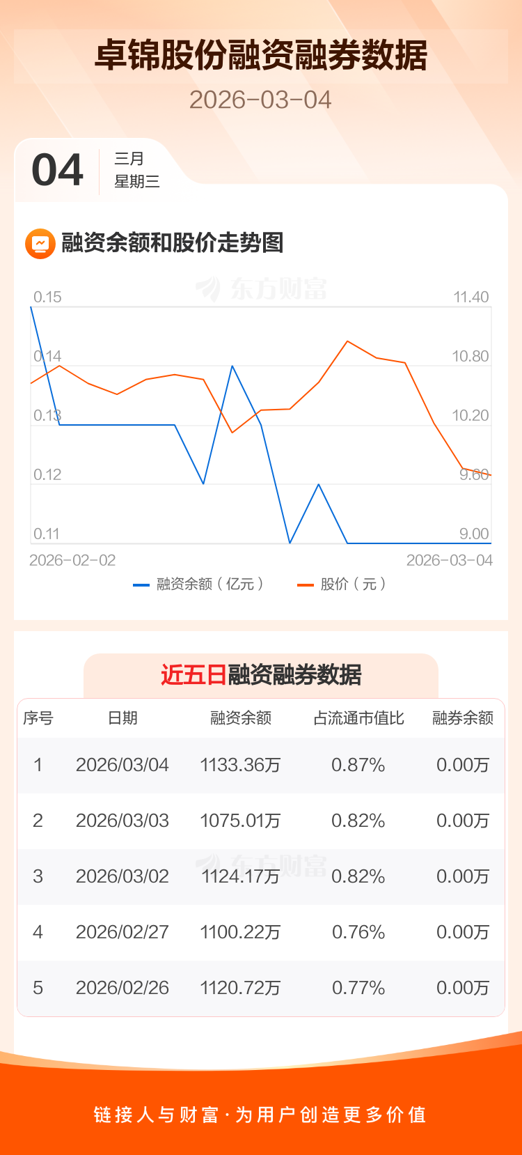 交易所最新数据显示,卓锦股份于2026年3月4日获融资买入213.19万元,融资偿还154.84万元,当日融资净买入58.35万元。目前,该股融资余额1133.36万,占流通市值比例为0.87%。