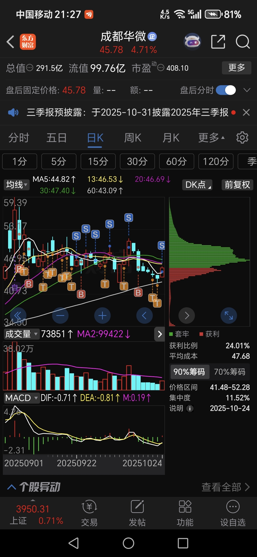 $成都华微(SH688709)$ 资金一直耗在成都华微,可惜他就是硬不起来,10月15号借新凯来的契机卖了去腾景科技,这周账户收获了20个点,前天又买回了部分成都华微,今天清仓走人,保持关注,哪天趋势反转了再杀回来。