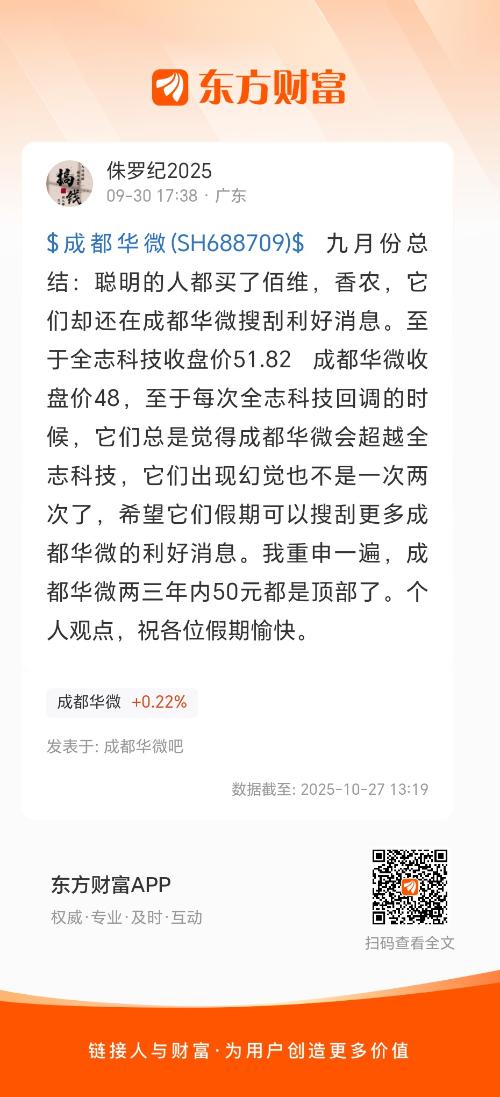 $成都华微(SH688709)$ 九月份总结:聪明的人都买了佰维,香农,它们却还在成都华微搜刮利好消息。至于全志科技收盘价51.82 成都华微收盘价48,至于每次全志科技回调的时候,它们总是觉得成都华微会超越全志科技,它们出现幻觉也不是一次两次了,希望它们假期可以搜刮更多成都华微的利好消息。我重申一遍,成都华微两三年内50元都是顶部了。个人观点,祝各位假期愉快。