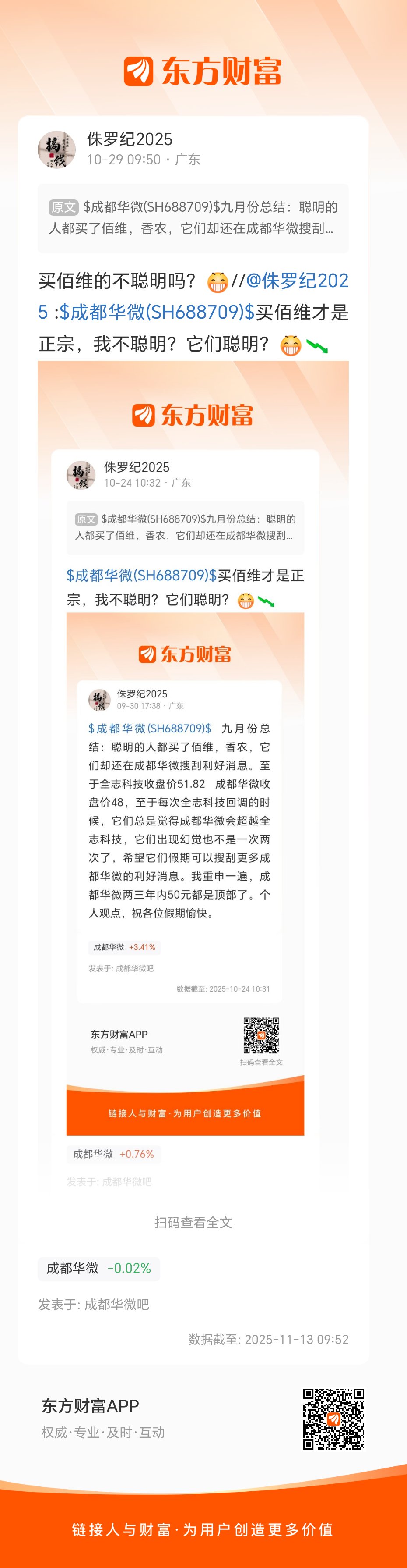 $成都华微(SH688709)$ 九月份总结:聪明的人都买了佰维,香农,它们却还在成都华微搜刮利好消息。至于全志科技收盘价51.82 成都华微收盘价48,至于每次全志科技回调的时候,它们总是觉得成都华微会超越全志科技,它们出现幻觉也不是一次两次了,希望它们假期可以搜刮更多成都华微的利好消息。我重申一遍,成都华微两三年内50元都是顶部了。个人观点,祝各位假期愉快。
