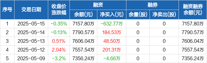 益诺思:融资净偿还632.77万元,融资余额7157.8万元(05-15)