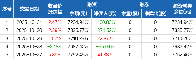 融资方面,当日融资买入768.23万元,融资偿还869.06万元,融资净偿还100.83万元。融券方面,融券卖出0股,融券偿还0股,融券余量0股,融券余额0元。融资融券余额合计7234.94万元。