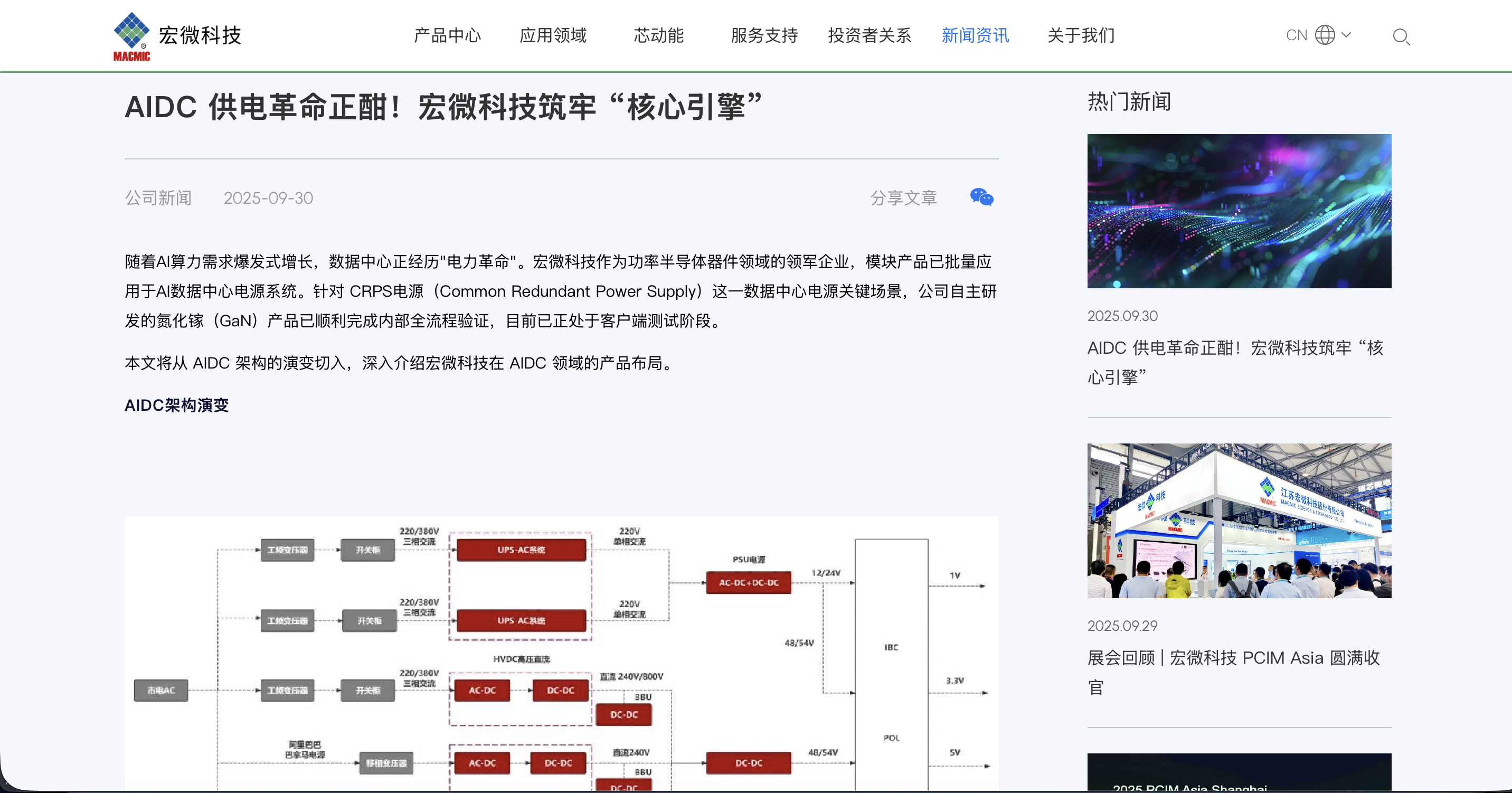 看公司网站,2025年9月30日发布的:AIDC供电革命正酣!宏微科技筑牢“核心