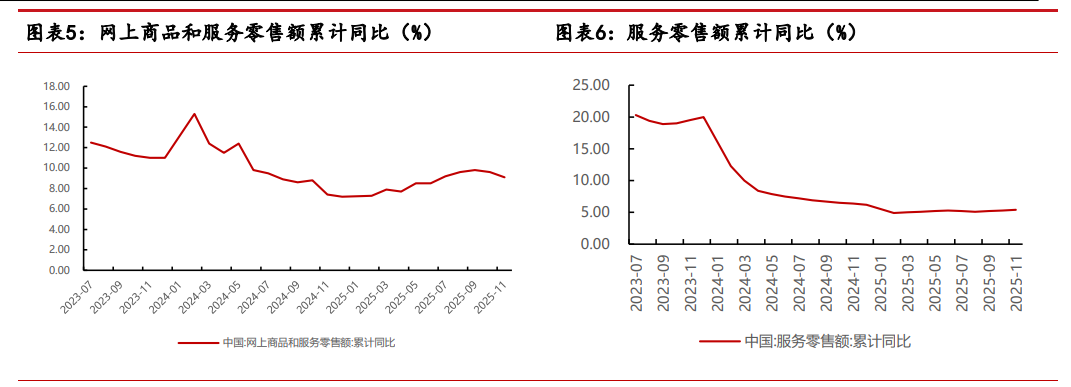 11月网上商品和服务零售额累计同比增速为9.1%,显著高于社零增速,凸显了网络销售的高景气度,亦是当前消费方式转型的体现。关注两点:一是服务消费保持稳固,11月服务零售额累计同比增速5.4%,较前值上涨 0.1pct,亦明显高于社零增速水平,且为年内阶段性高点。二是智能经济消费呈现高成长性。智能穿戴设备消费增长亮眼,如 AI 眼镜、智能手表等智能穿戴产品的网上零售额同比增长23.1%,反映出消费者对智能产品的需求持续提升;数字消费整体保持较快增长,1-10月全国网上零售额同比增长9.6%,其中网络服务消费增长21%,即时电商销售额增长24.3%,进一步体现了数字消费的活力。