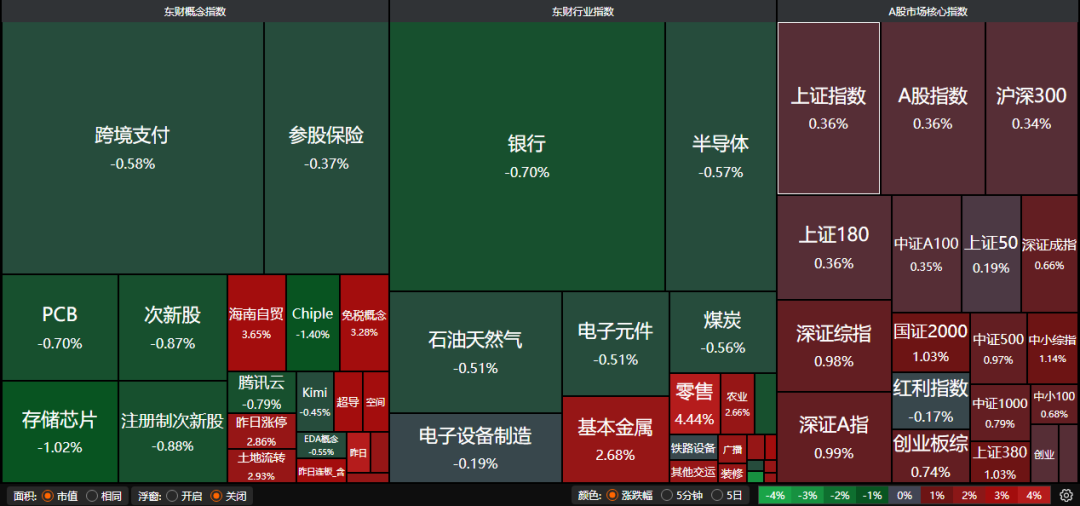 昨日A股三大指数集体上涨,沪指涨0.36%,深证成指涨0.66%,创业板指涨0.49%。沪深两市成交额17259亿,较上一交易日放量704亿。行业板块呈现普涨态势,房地产服务、商业百货、包装材料、食品饮料、纺织服装、家用轻工、汽车服务、房地产开发板块涨幅居前,贵金属、半导体板块跌幅居前。