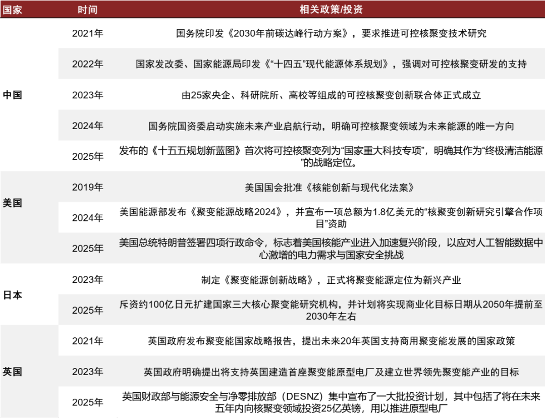 作为全球能源格局变革的前沿领域,近年来各国政府密集出台核聚变发展战略,推动跨部门协同,明确核聚变在未来能源结构中的核心定位。中国近期将核聚变纳入“十五五”及未来产业重点方向,美国、日本、英国等国则通过专项立法、资金引导等方式加快落地节奏,形成从顶层设计到产业实践的全链条支持体系。各国政府在政策与资金方面的协同发力,正在显著缩短核聚变商业化进程的时间线,也为全球核聚变产业生态的初步构建奠定基础。