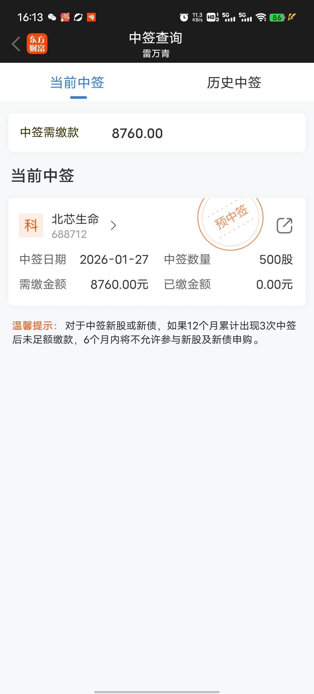 $北芯生命(SH688712)$ 预中签是什么意思